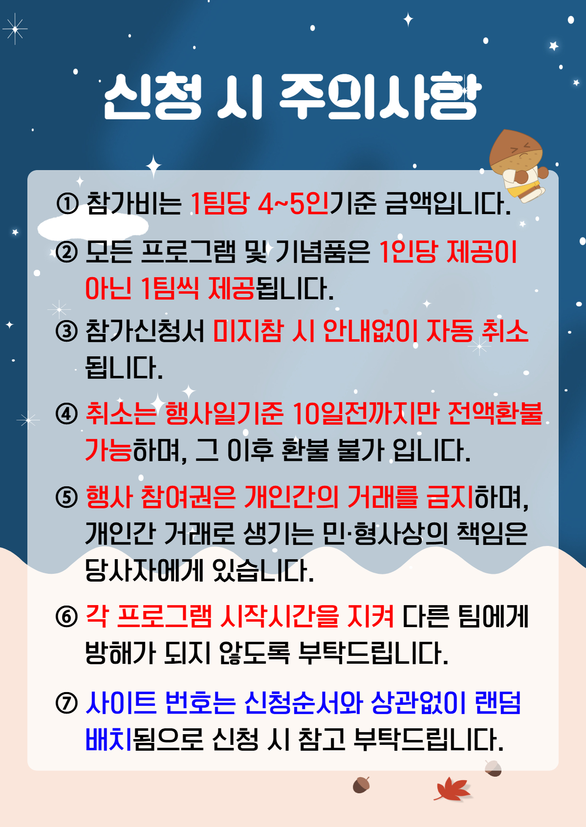 - 최종 참여자 리스트 확정 후 입금계좌 문자로 보내드릴 예정이며 2일 내 미입금 시 자동취소 됩니다.